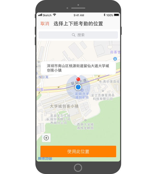默认定位在当前位置,也可以使用搜索功能找到考勤地点