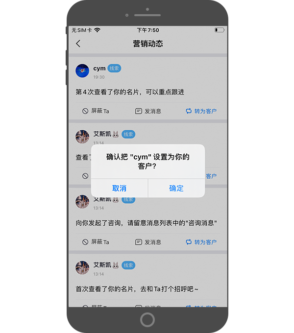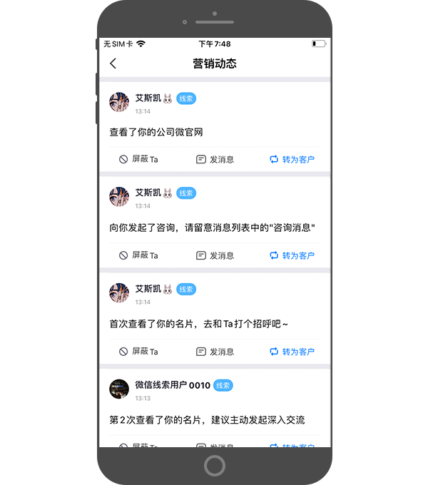 营销动态列表中按照时间顺序展示动态详情,同时也可以直接与线索发消息,或是一键转为客户等操作;