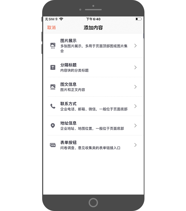 - 联系方式:可选择添加电话、微信、邮箱等联系方式,一般位于页面底部;