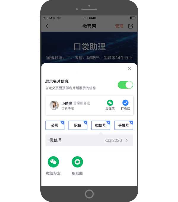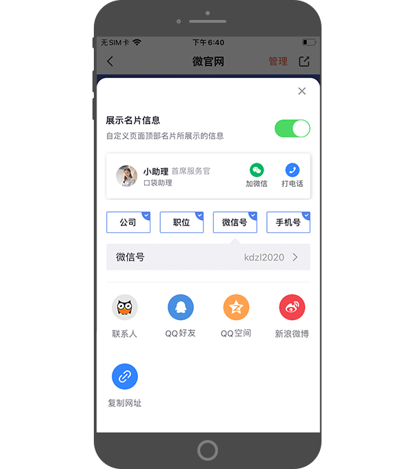 - 直接将微官网内容以网页形式发送给QQ、微博等社交平台,同时可选择展示个人名片信息以及联系方式。