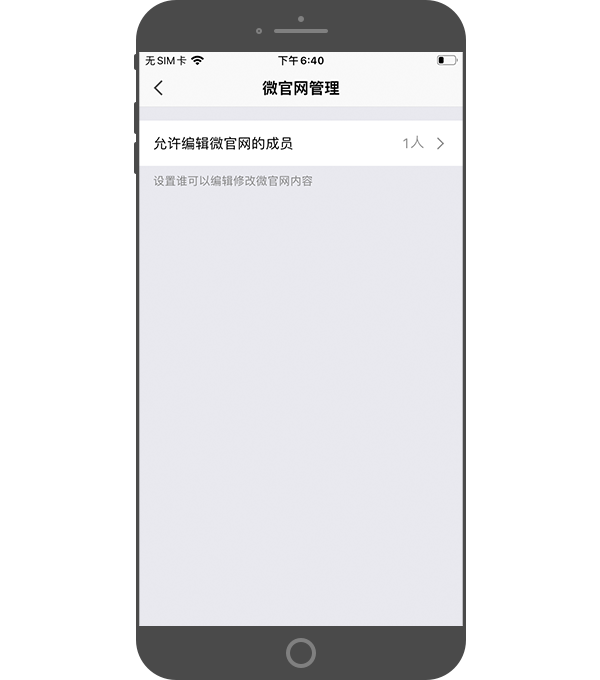 - 设置谁可以编辑修改微官网内容,比如可以为企业的运营人员添加权限,负责微官网的更新维护。