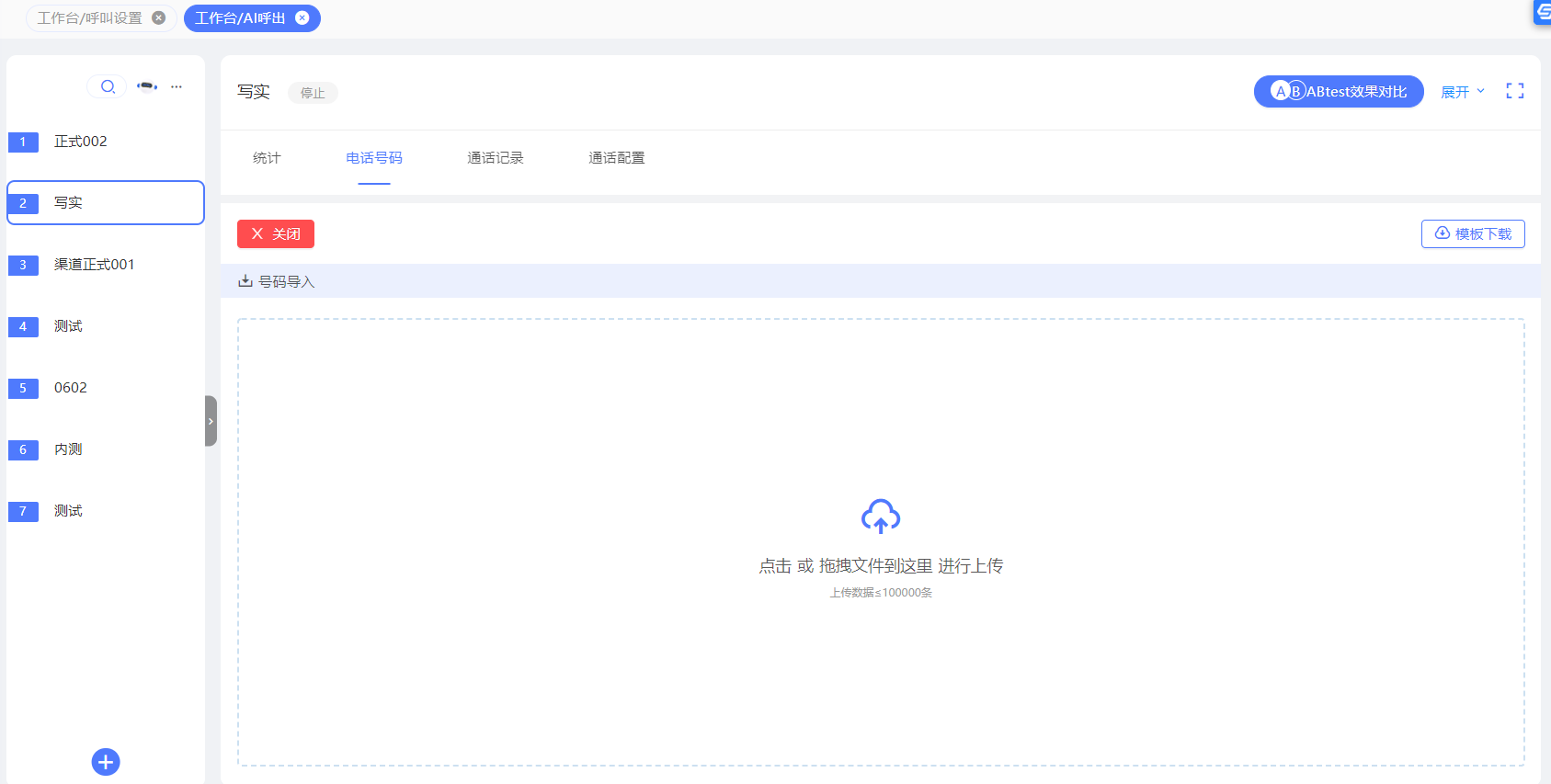 可导入自有的号码资源,在工作台-AI呼出-电话号码-导入,即可导入通话列表