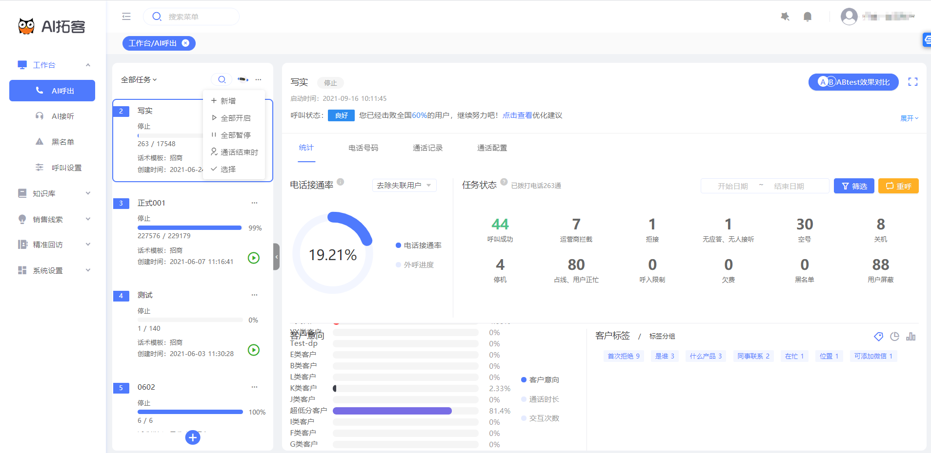 - 工作台-AI呼出-任务列表-点击...-新增,即可创建新任务