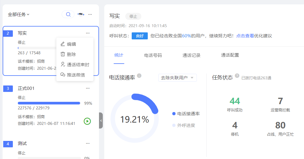 - 从任务进度条中,我们可以看到当前的外呼任务进度,点击“停止”黄色按钮,即可暂停外呼任务