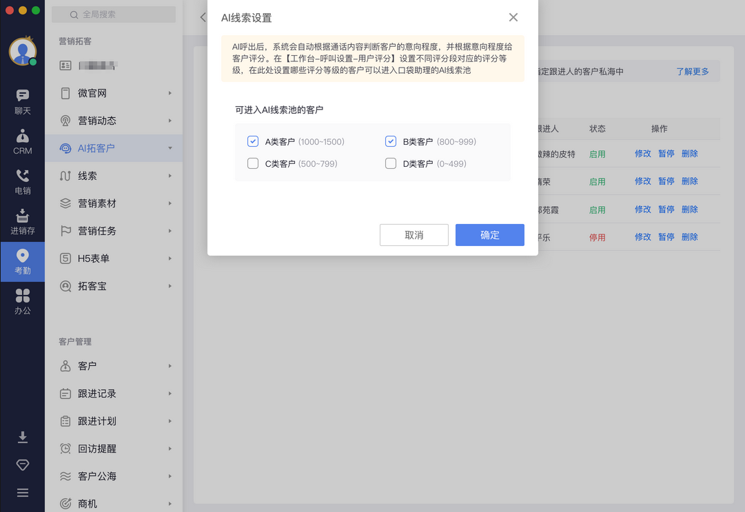 - 有AI拓客管理权限的用户,可打开AI拓客-AI拓客管理-AI线索导入设置,设置允许哪些评分等级的线索,可导入到AI线索池。