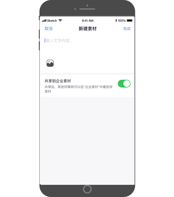 - 这里将展示自己编辑创建的朋友圈素材,同时,也可以把自己创建的素材共享到企业素材中,方便其他同事转载分享;