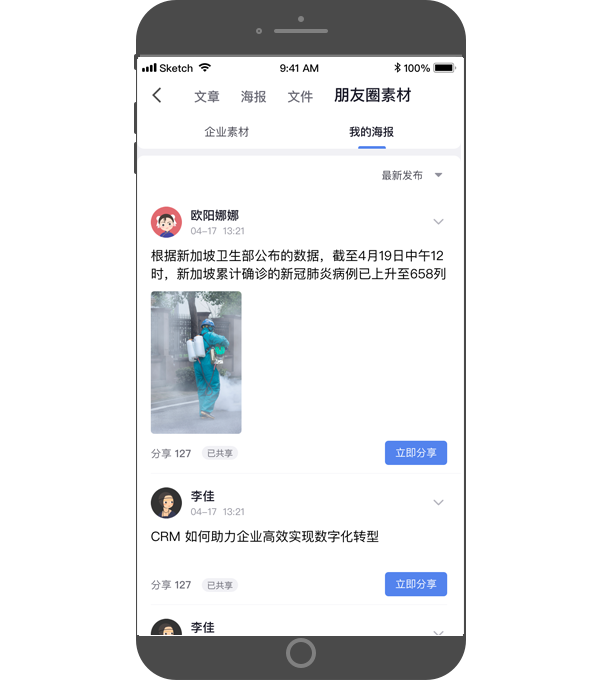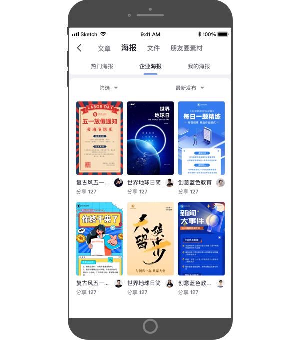- 成员共享的海报,都将展示在此,员工可以根据海报分类标签,轻松筛选所需的海报内容,一键分享社交营销;