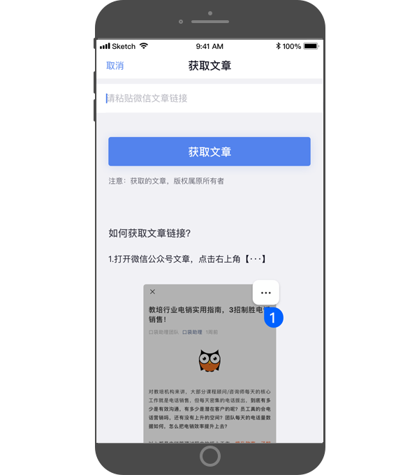 - 从链接获取文章:通过复制粘贴微信文章链接,直接获取文章内容作为自己的文章素材,获取的文章,版权归原所有者。