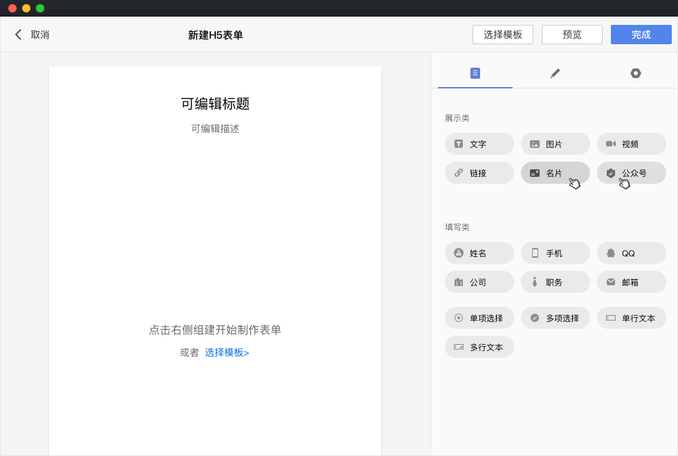 - 填写类:包括姓名、手机、选择题等组件,选择此类组件后,将生成可填写的表单。