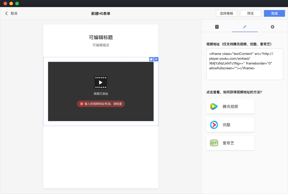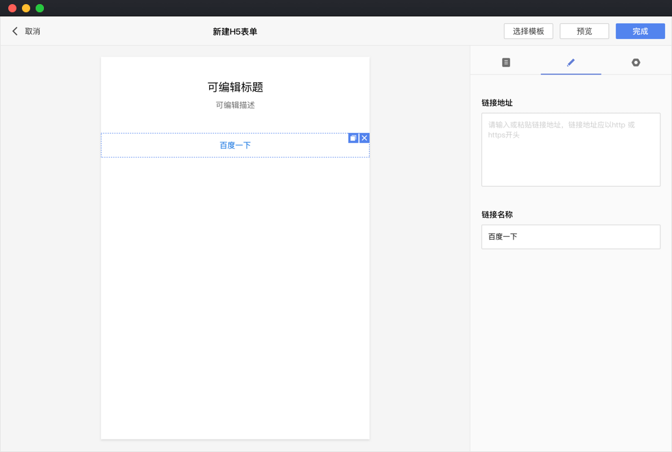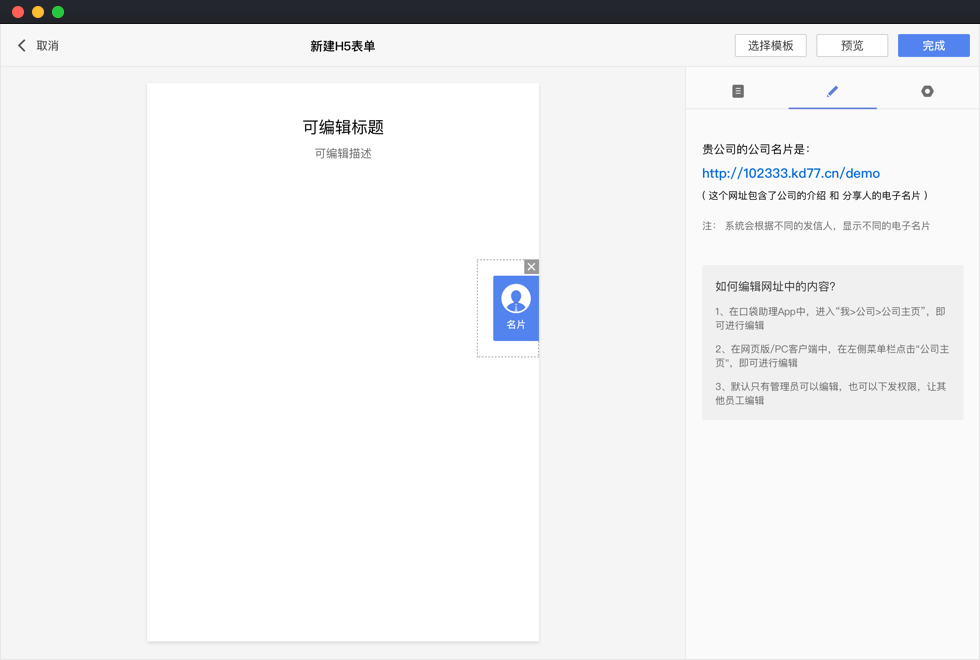 进入“应用-H5表单”,点击任一表单右上角的图标,可选择编辑或删除该表单。