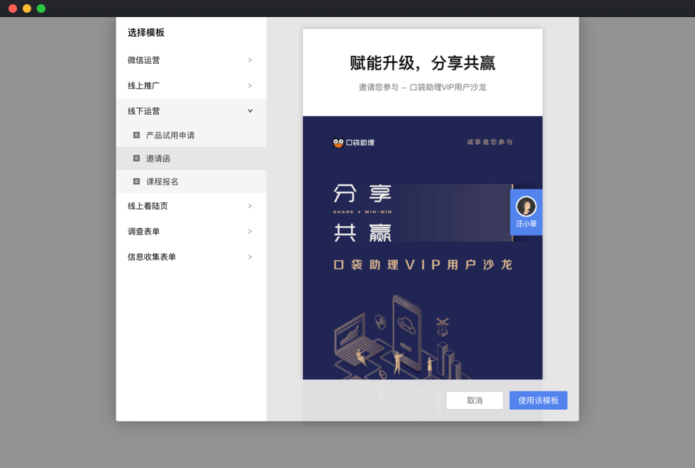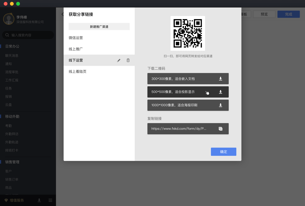 - 点击“获取分享链接”,为每个渠道制定一个专属的分享链接/二维码,并可查看该渠道的分享情况和统计数据。比如:为一个线下的展会,生成专属的分享二维码;邀请一个有影响力的人,为他生成专属的分享链接。