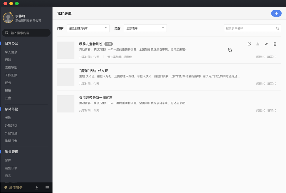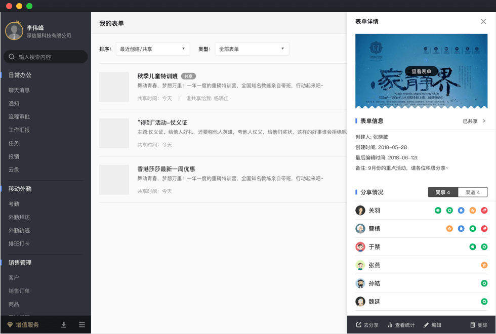 进入“应用 - H5表单”,点击任一表单,即可查看对应的表单信息和分享情况,还可以分享表单、查看统计、编辑表单和删除表单。