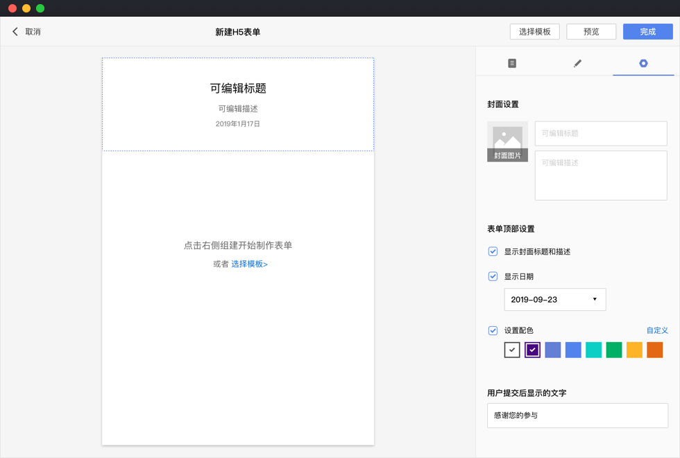 - 编辑内容后,点击“表单设置”,可以设置标题、封面、描述、日期、配色、用户提交后显示的文字 等。