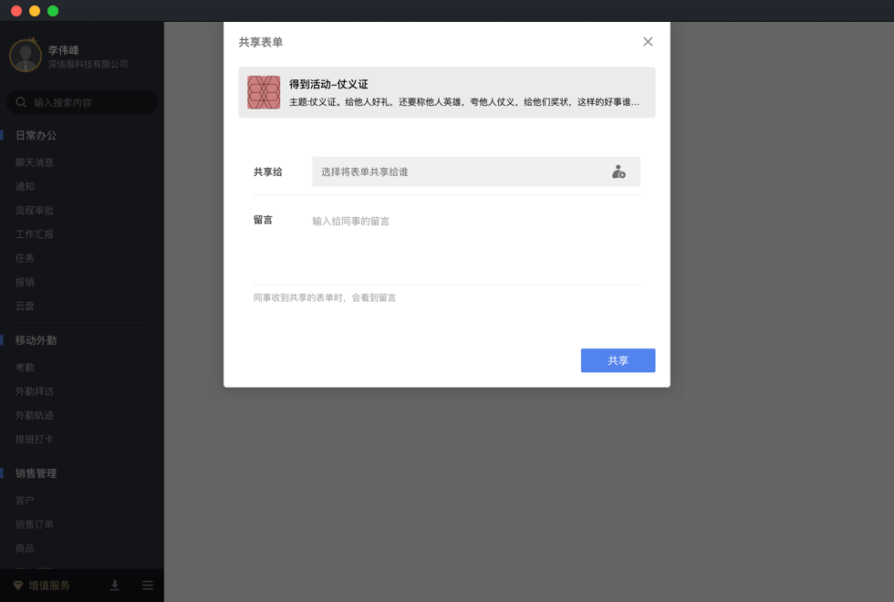 - 点击“去共享”,表单共享给同事后,他们可以用任意方式进行分享、传播,每个同事的分享情况和获客数据只有他们自己能查看。