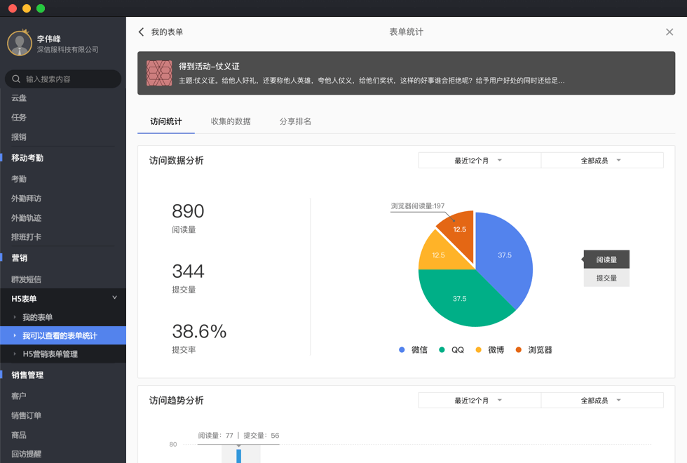 - 可查看该H5表单发布后的访问数据,包括阅读量、提交量、提交率等。