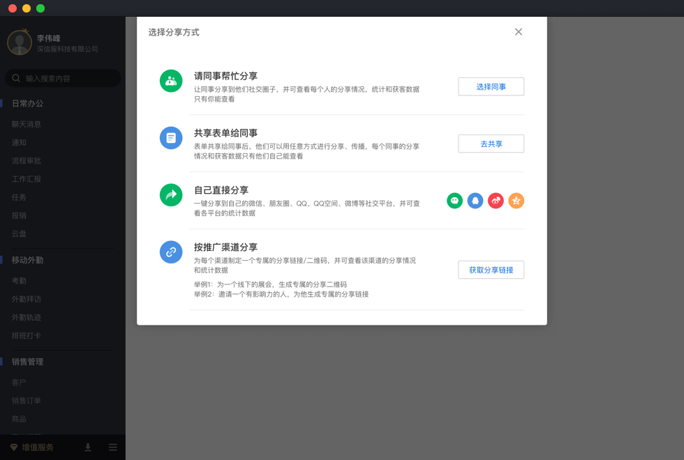 - 点击“选择同事”,让同事分享到他们社交圈子,并可查看每个人的分享情况,统计和获客数据只有你能查看。