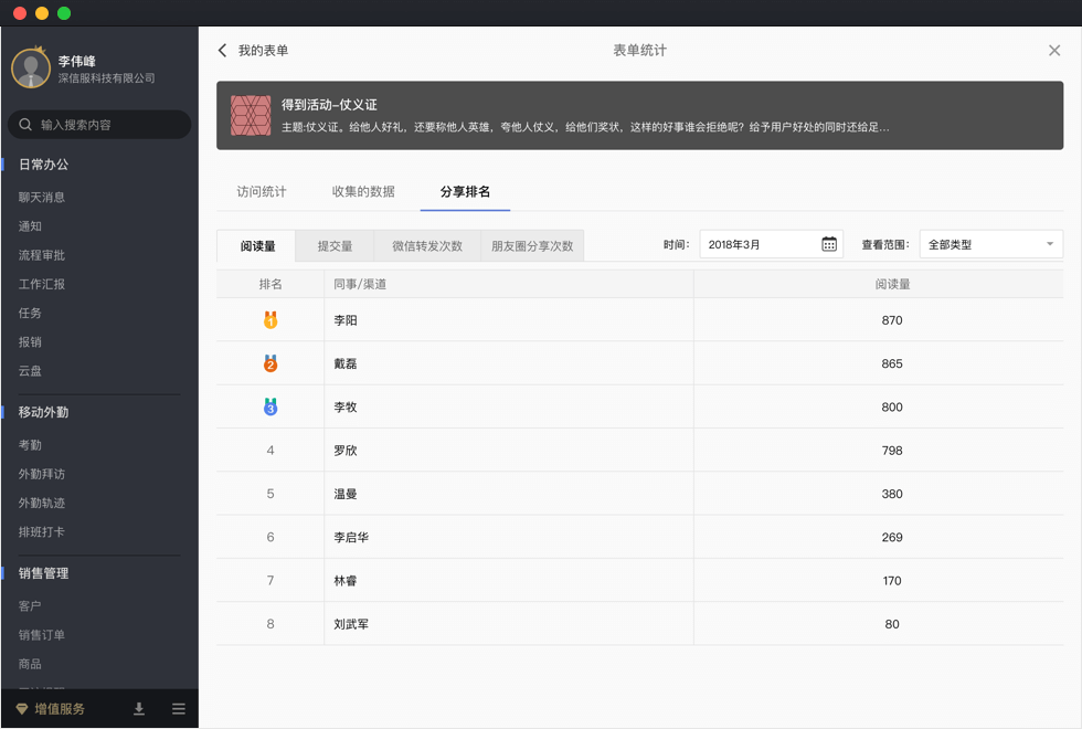 - 可查看该H5表单在 阅读量、提交量、微信转发次数、朋友圈分享次数 4个方面对应的分享人的排名情况。
