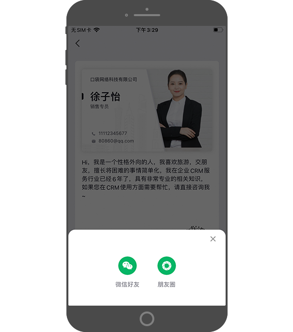 - 分享到朋友圈:通过链接分享到朋友圈,微信好友打开即可了解更多名片详情;