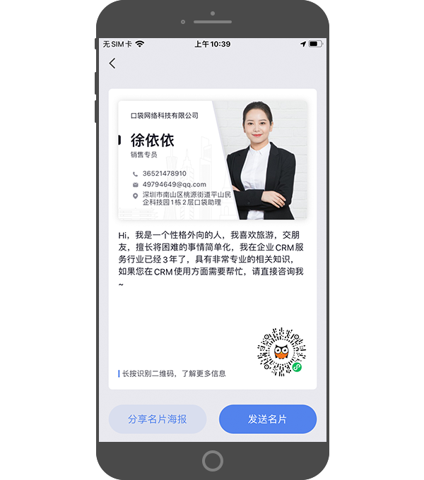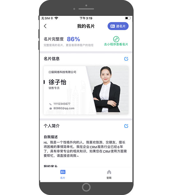 完善好名片信息后,可随时点击右上角“递名片”,一键分享给微信好友或是朋友圈,完整度更高的名片,更容易获得客户的信任。