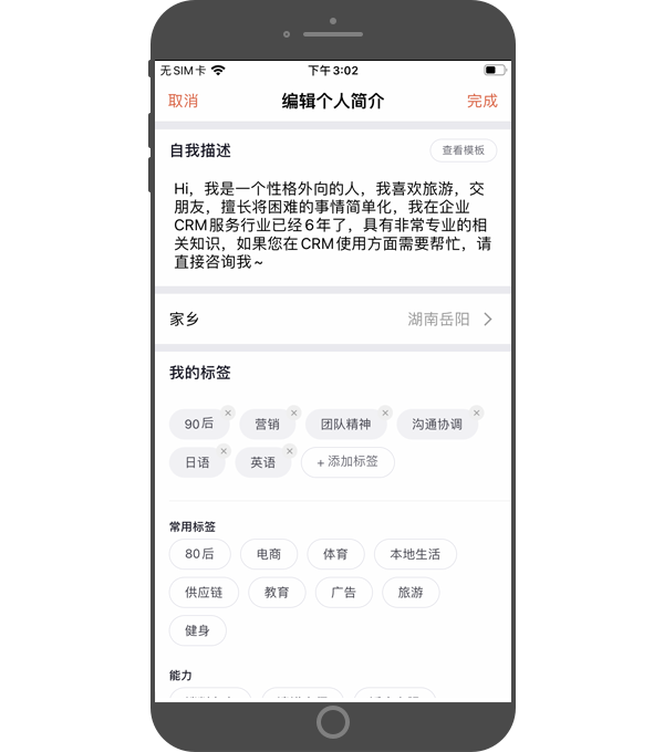 - 我的标签:自我挑选合适的标签展示,以标签的形式精简、清晰地展示给客户。比如:90后、会英语、解决方案专家等;