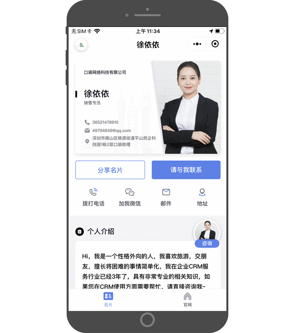 - 当用户在查看你的名片时,Ta可以直接通过点击右侧咨询窗口,快速发起在线沟通咨询。