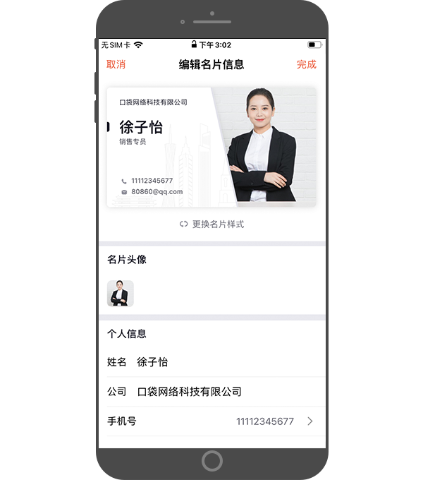 - 名片样式:通过切换不同风格的名片样式,个性化展示名片内容;