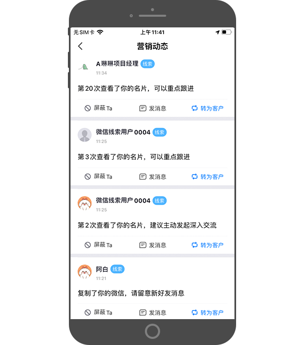 - 当有用户点击你的名片时,将自动搜集、记录用户的浏览行为,包括第几次查看你的名片、是否有联系意向等,都会展示在“营销动态”功能中。