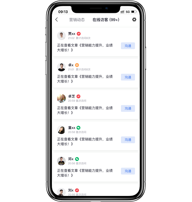 现在,只要访客查看了从口袋助理分享的素材,不管是从微信、微博等,我们都能主动提醒到访客在线动态,销售再及时发起沟通获客,不遗漏每一个商机~