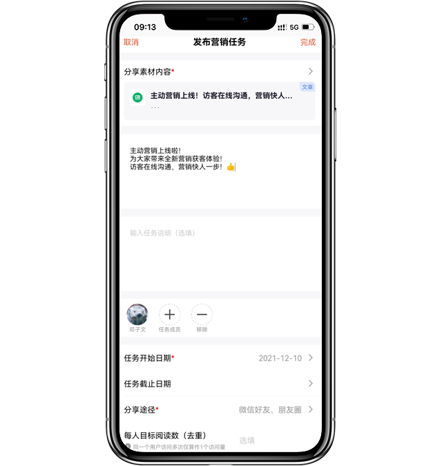 发布营销任务时,现在支持设置分享文案啦!成员在执行任务时只需一键复制,即可分享文案+素材,营销分享更省时间、更轻松~