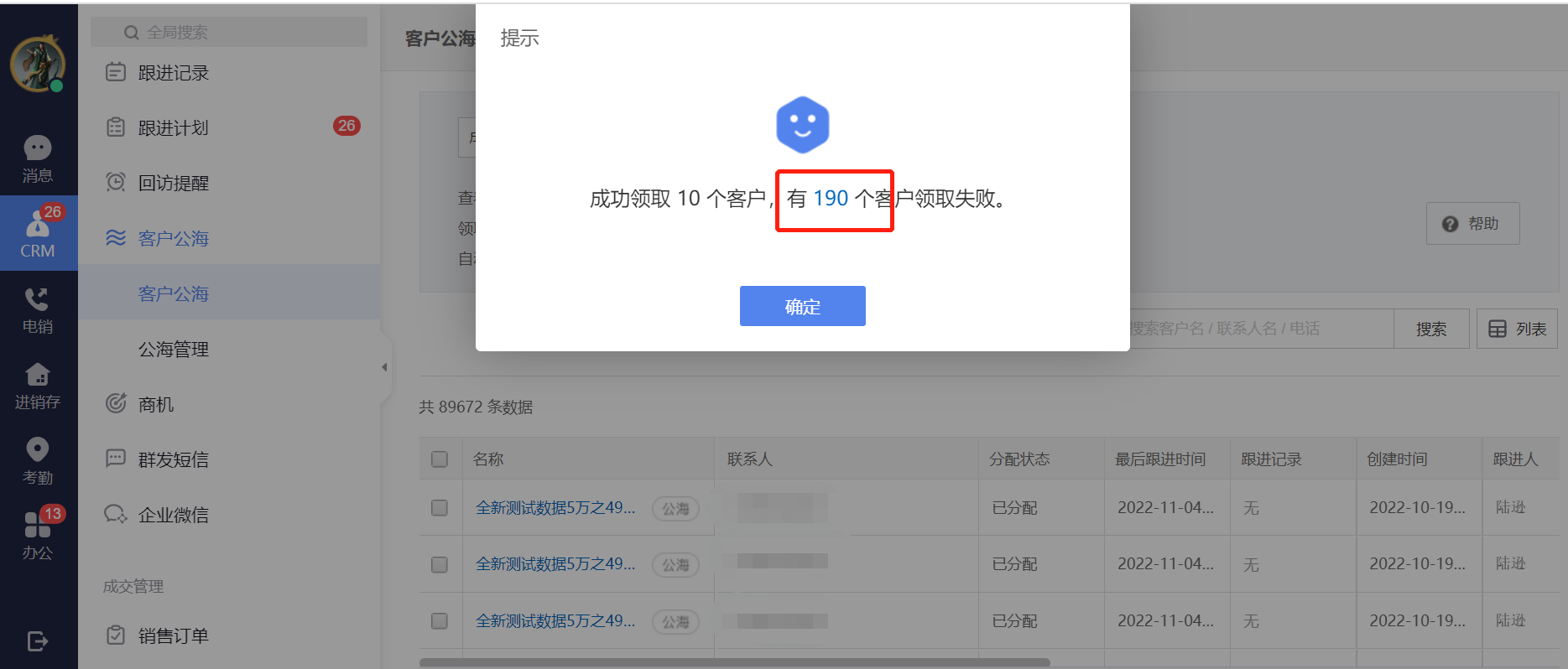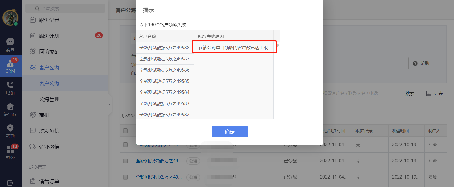 领取失败后,点击弹框里的数字,即可看到失败原因,比如领取达到上限、xx天内不能重复领取客户等等,一般都要公司管理人员放开限制方可继续领取