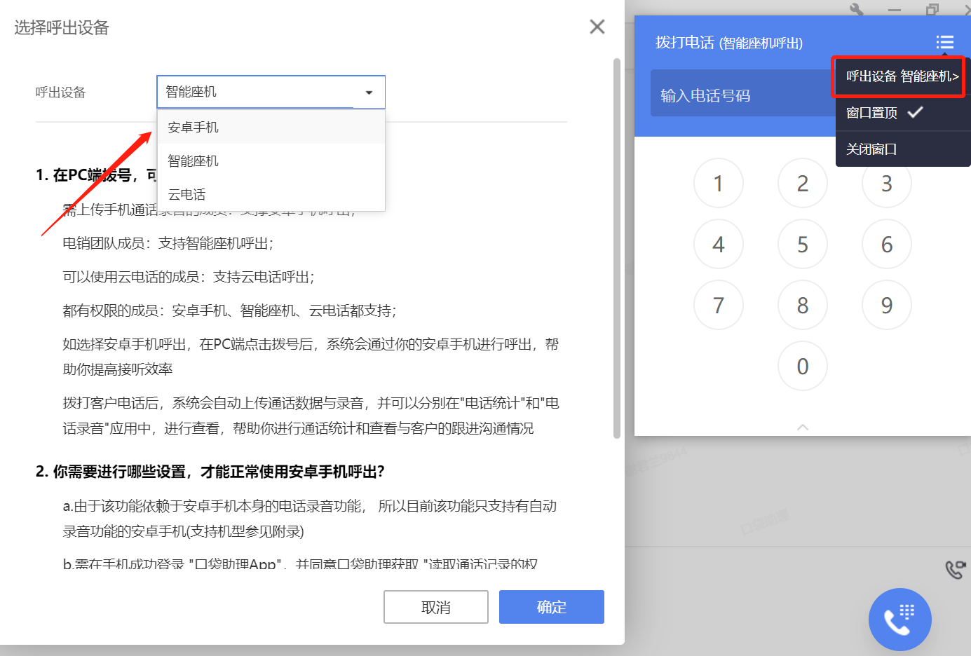 一般是因为呼出设备选了智能座机。如果您实际就是用的话机呼出,那么检查下数据线和电脑接口是否异常;如果实际是用云电话或者安卓手机呼出,那么拨号盘处点击呼出设备,切换到实际的呼出设备即可。设备对应关系: